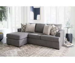 The Alexandria sofa by Broyhill has classic but contemporary styling, soft shaping to the front arms and gunmetal finish nailhead accents across the front rail. This comfortable sofa features deep seating, reversible cushions and high density foam. The neutral gray polyester chenille upholstery and included accent pillows in designer fabrics will add luxury and comfort to any living area.